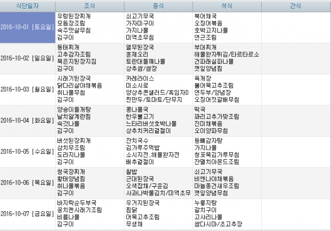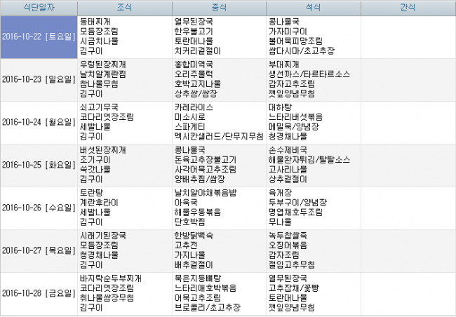2016년 10월 식단안내 페이지 정보 작성자 신성양로원 댓글 0건 조회 1,931회 작성일 16-09-27 15:27 본문 주간식단표입니다. 목록 이전글2016년 11월식단안내 16.10.27 다음글2016년 9월 식단안내 16.09.02