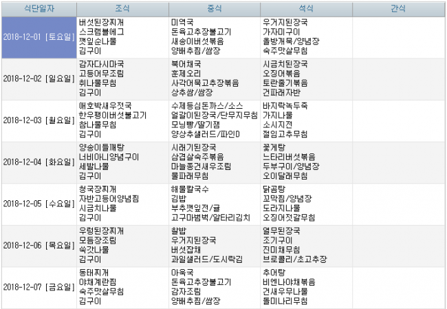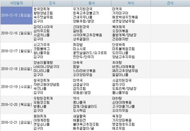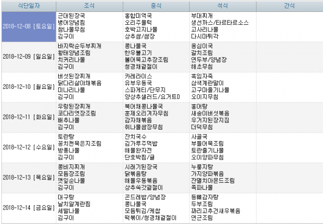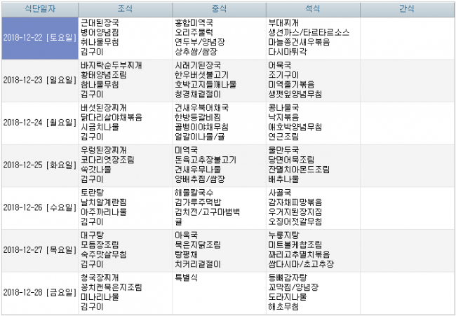 2018년 12월 식단안내 페이지 정보 작성자 신성양로원 댓글 0건 조회 1,756회 작성일 18-11-26 12:36 본문 주간 식단표 입니다. 목록 이전글2019년 1월 식단안내 18.12.27 다음글2018년 11월 식단안내 18.10.29