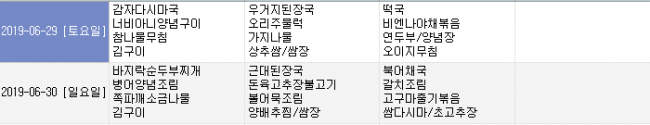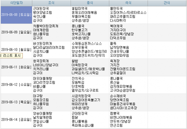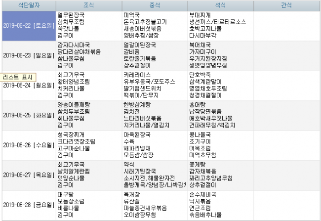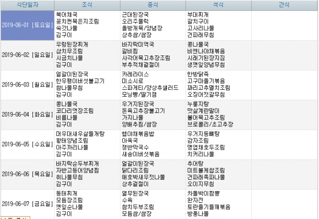 2019년 6월 식단안내 페이지 정보 작성자 신성양로원 댓글 0건 조회 1,689회 작성일 19-05-27 11:08 본문 주간식단표 입니다 후원 및 시장 수급사정에 의해 식단이 일부 변경될 수 있습니다. 목록 이전글2019년 7월 식단안내 19.06.24 다음글2019년 5월 식단안내 19.04.29