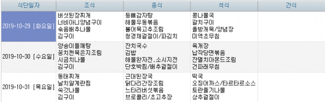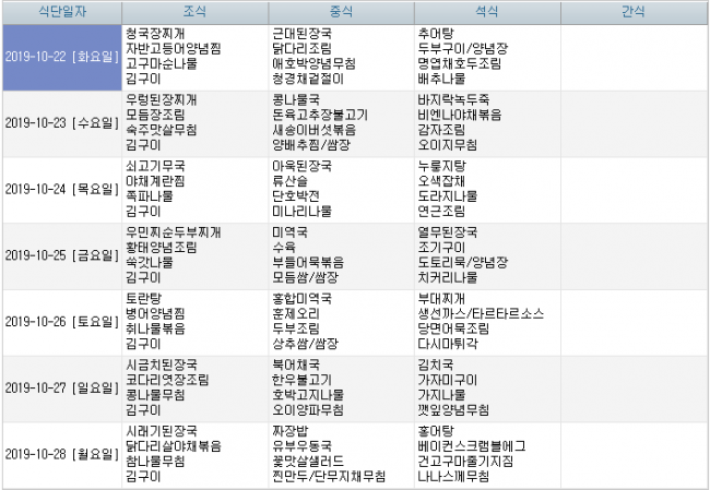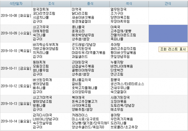 2019년 10월 식단안내 페이지 정보 작성자 신성양로원 댓글 0건 조회 1,870회 작성일 19-09-30 10:44 본문 10월 주간식단표 입니다. 목록 이전글2019년 11월 식단안내 19.10.28 다음글2019년 9월 식단안내 19.08.26