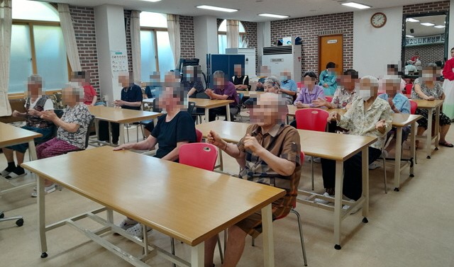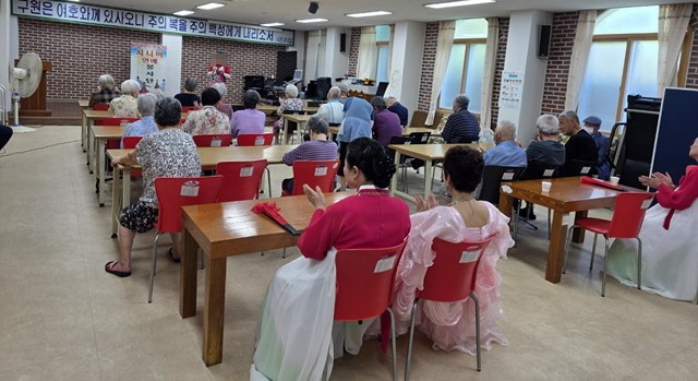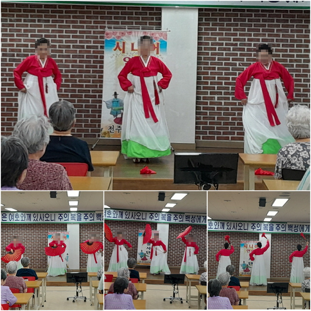 어르신들은 가수들의 멋진 노래와 아름다운 부채춤 공연 등을 감상하시고
