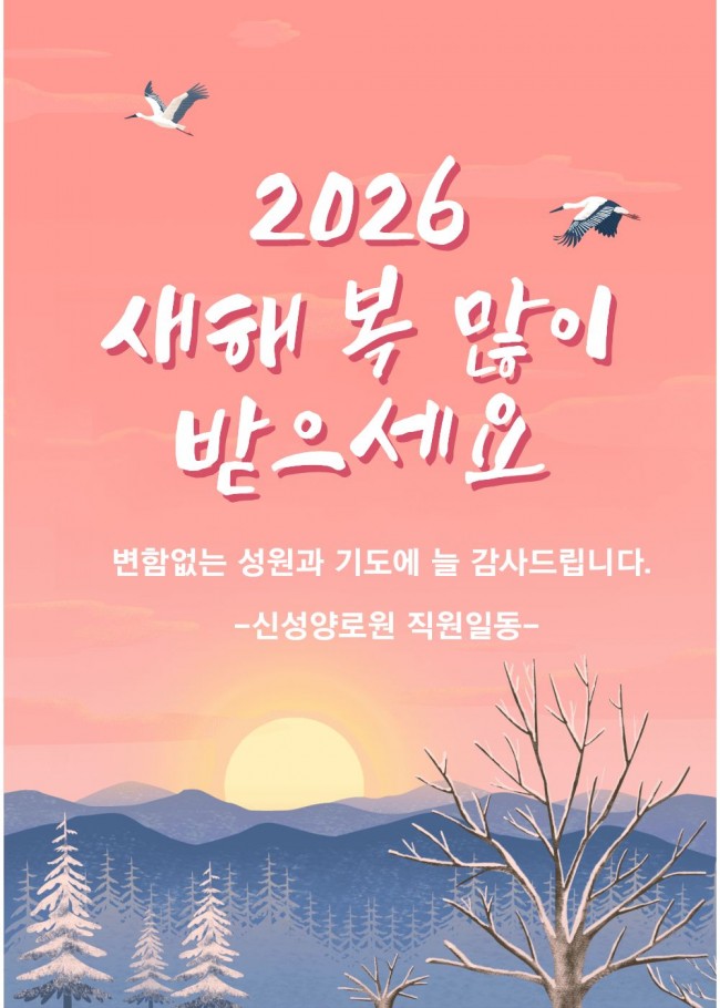 새해 복 많이 받으세요 페이지 정보 작성자 신성양로원 댓글 0건 조회 165회 작성일 -1-11-30 00:00 본문 - 목록 이전글2025년 12월호 소식지 26.01.02 다음글2026년도 세입, 세출 예산안 25.12.23