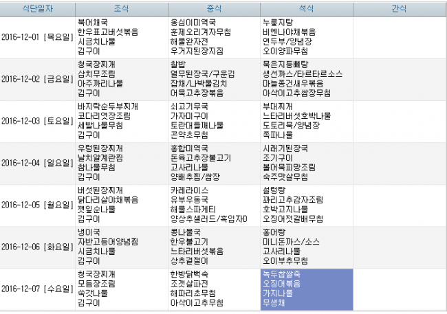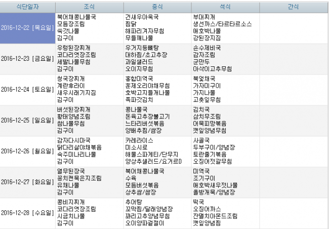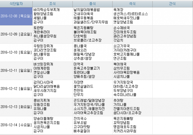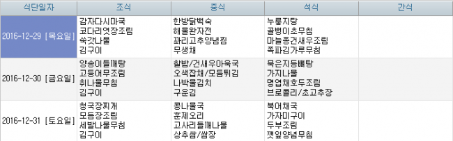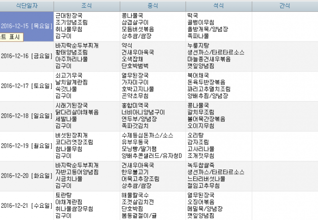 2016년 12월 식단안내 페이지 정보 작성자 신성양로원 댓글 0건 조회 1,762회 작성일 16-11-30 17:40 본문 12월 식단입니다. 목록 이전글2017년 1월 식단안내 17.01.05 다음글2016년 11월식단안내 16.10.27