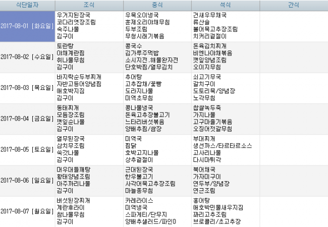 2017년 8월 식단안내 페이지 정보 작성자 신성양로원 댓글 0건 조회 1,753회 작성일 17-08-04 10:19 본문 8월 식단표 입니다. 시장 수급사정에 따라 식단이 변경 될 수 있습니다. 목록 이전글2017년 9월 식단안내 17.09.06 다음글2017년 7월 식단안내 17.06.29