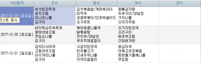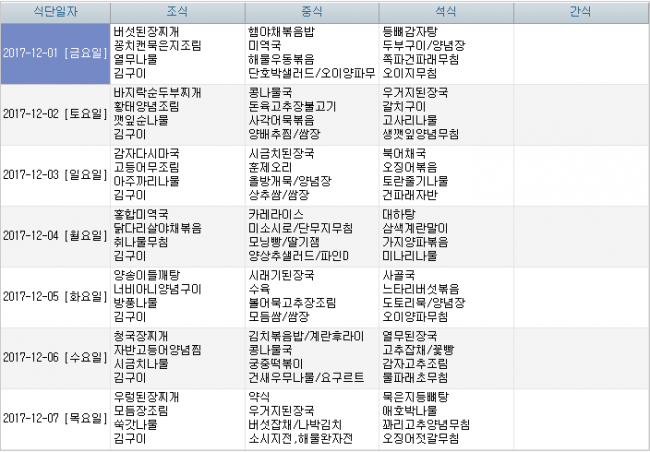 2017년 12월 식단안내 페이지 정보 작성자 신성양로원 댓글 0건 조회 1,737회 작성일 17-11-30 13:55 본문 12월 주간식단표 입니다. 목록 이전글2018년 1월 식단안내 18.01.08 다음글2017년 11월 식단안내 17.11.02