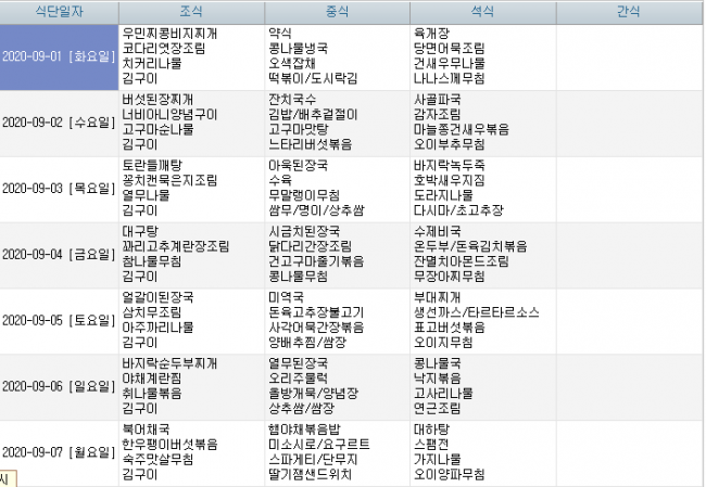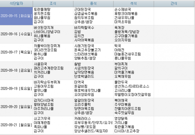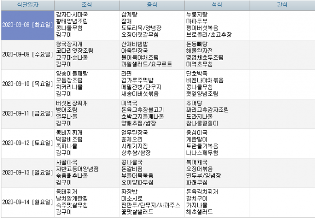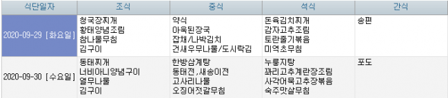 2020년 09월 식단안내 페이지 정보 작성자 신성양로원 댓글 0건 조회 1,860회 작성일 20-09-02 08:11 본문 주간식단표 입니다 태풍으로 인한 식자재 수급에 어려움이 있어 식단이 변경될 수 있습니다. 목록 이전글2020년 10월 식단안내 20.10.05 다음글2020년 08월 식단안내 20.07.27