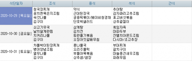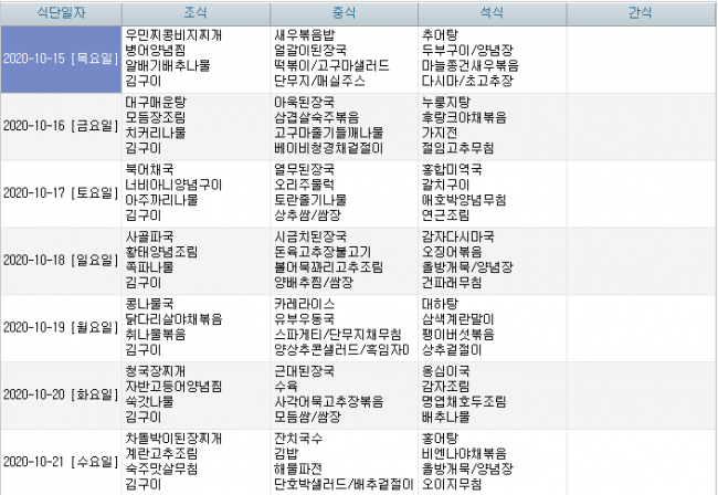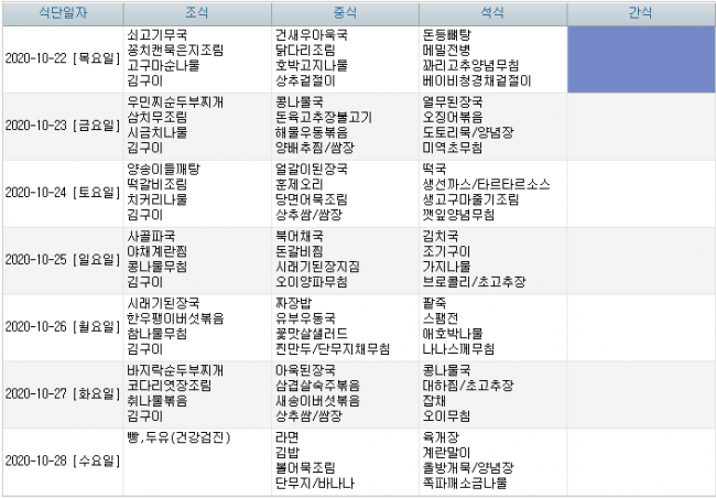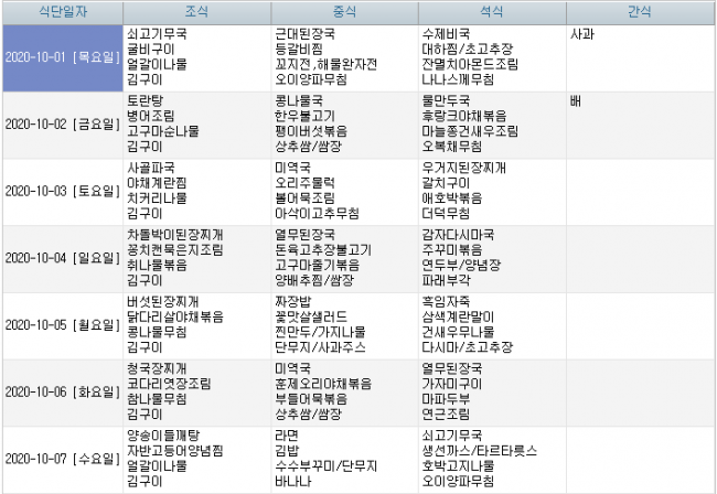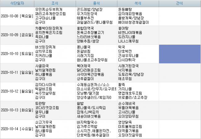 2020년 10월 식단안내 페이지 정보 작성자 신성양로원 댓글 0건 조회 1,724회 작성일 20-10-05 17:16 본문 10월 주간식단표 입니다. 목록 이전글2020년 11월 식단안내 20.10.29 다음글2020년 09월 식단안내 20.09.02