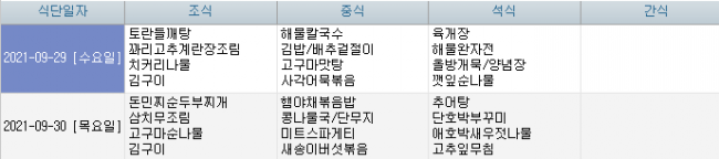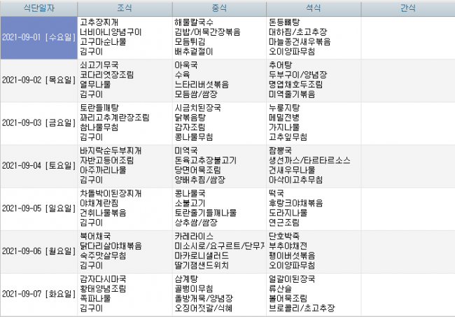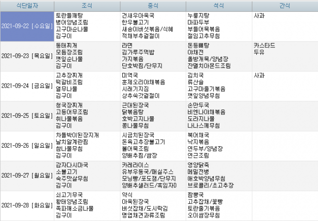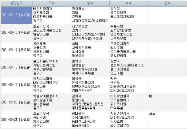 2021년 09월 식단안내 페이지 정보 작성자 신성양로원 댓글 0건 조회 1,488회 작성일 21-08-30 09:22 본문 9월 주간 식단표 입니다. 가을 장마로 식재수급에 어려움이 있어 식단이 변경 될 수 있습니다. 목록 이전글2021년 10월 식단안내 21.09.28 다음글2021년 08월 식단안내 21.07.27
