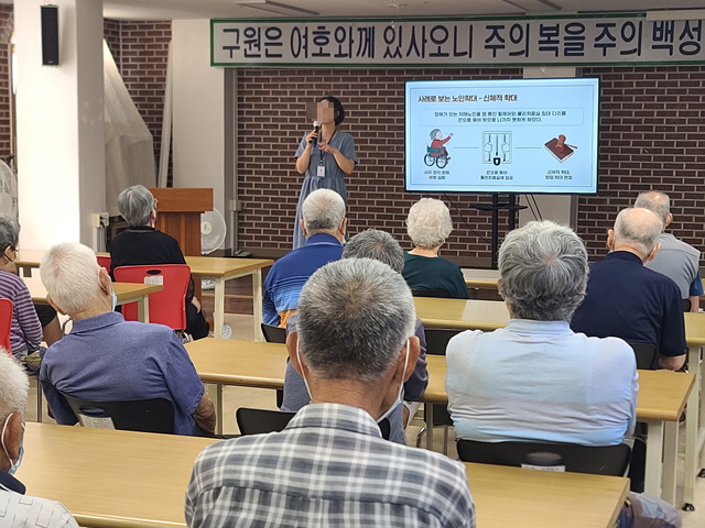 [노인 인권 및 학대 예방 교육]을 실시하였습니다. 어르신들과 종사자, 두 차례에 걸쳐 진행되었으며 어르신들께서는 노인 학대의 정의와 종류,