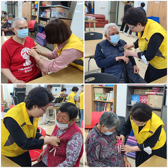 효사랑가족 요양병원 직원들이 방문하여 어르신들께 카네이션을 달아드리고