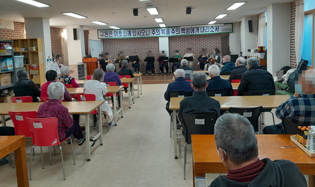 어르신들은 잔잔하면서도 선명한 음색의 만돌린 연주를 편안하게 감상하시며 친숙한 노래가 연주 될 때에는